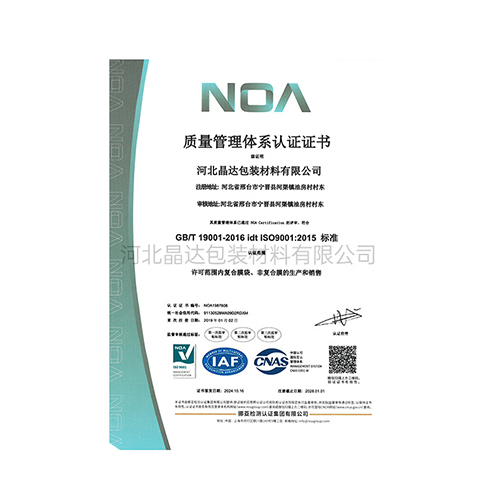 河北晶(jīng)達包裝材料有限公司(sī)以通過GB/T 19001-2016 idt Iso9001:2015 標準(zhǔn)、ISO14001-2015環境管理(lǐ)體係認證、ISO45001-2018職業健康安全管理體(tǐ)係認證、GB/T 39604-2020社會責任管(guǎn)理體係認證。